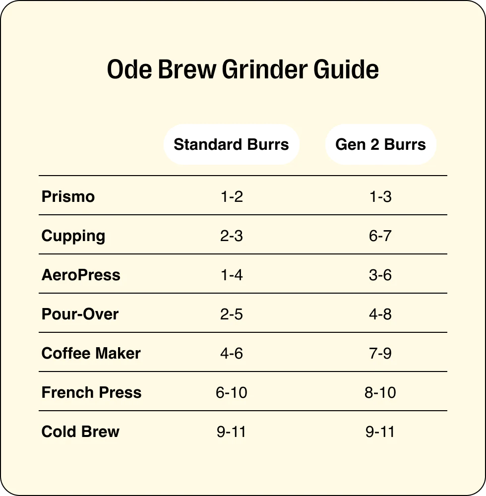 What are the grind settings for Ode Gen 2 Brew Burrs